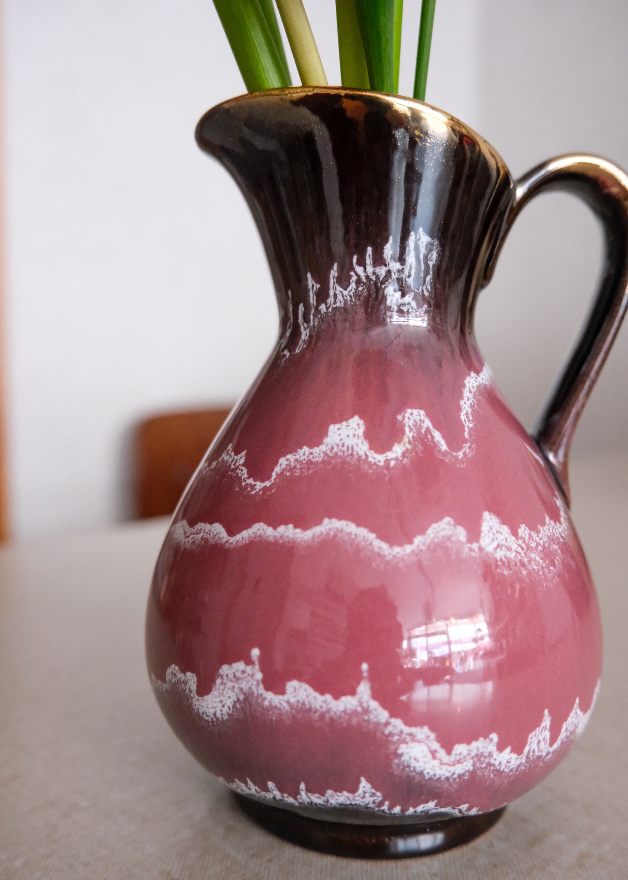 縁がゴールドに彩られ、流れる釉薬が描く曲線は