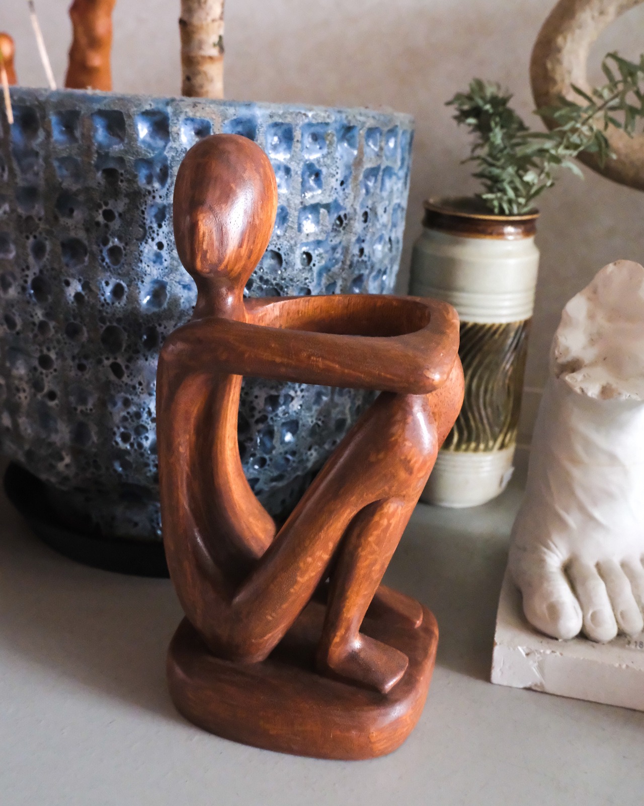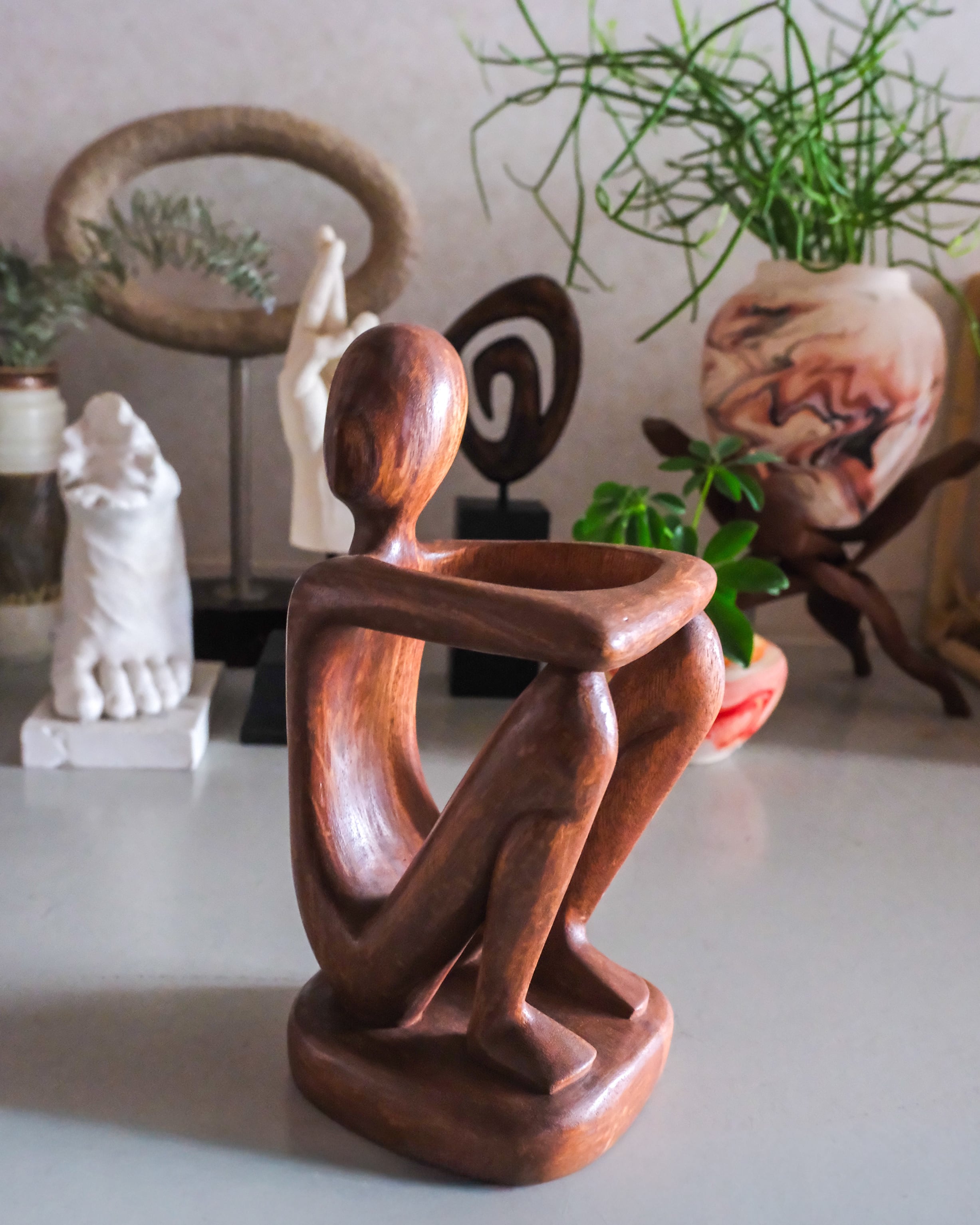 植木鉢を抱えさせたり、コップをかませてお花を飾ったり、リビングでリモコンホルダーにしても素敵です。