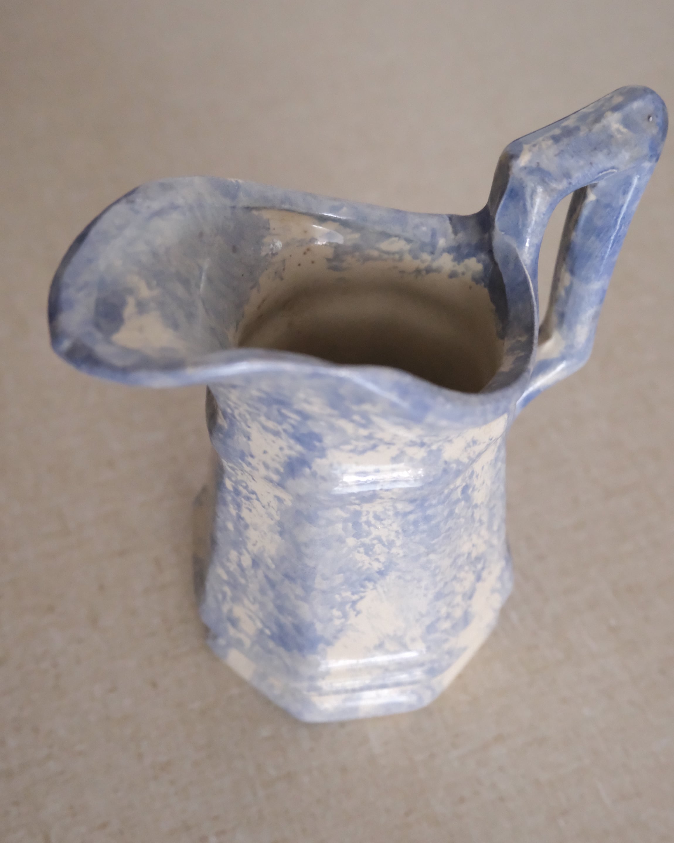 まだらな淡いブルーと野花を摘んだようなブーケは良く似合います。ハンドルはキリッとしたフォルムで甘さを中和し、どんな空間にもなじむバランスの取れた陶器です。