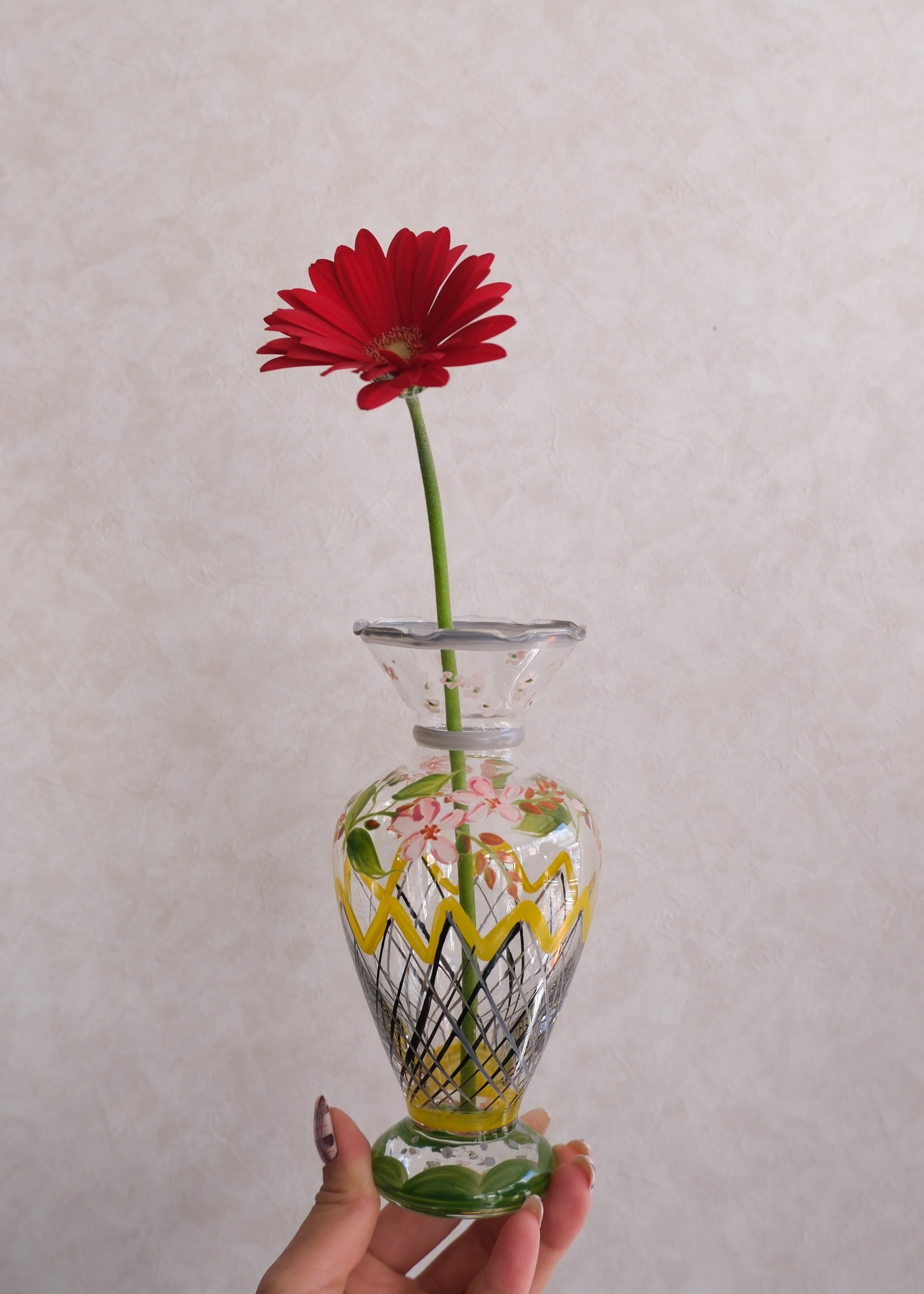 アメリカで買い付けましたハンドペイントが施されたキュートなガラスベースです。