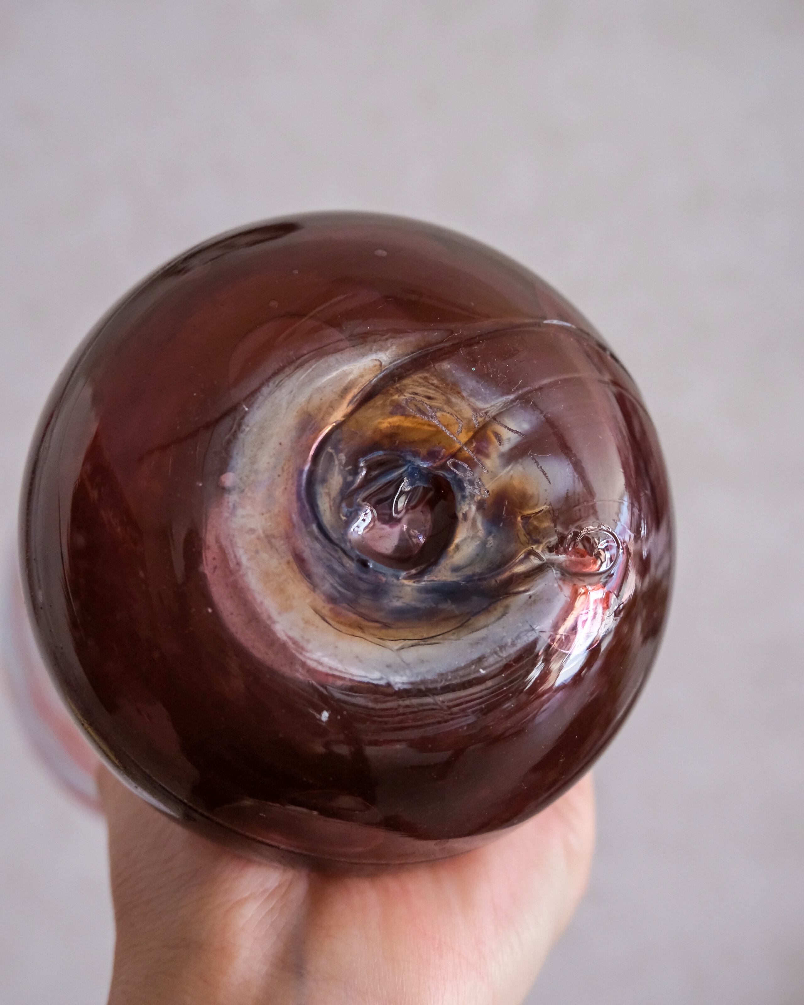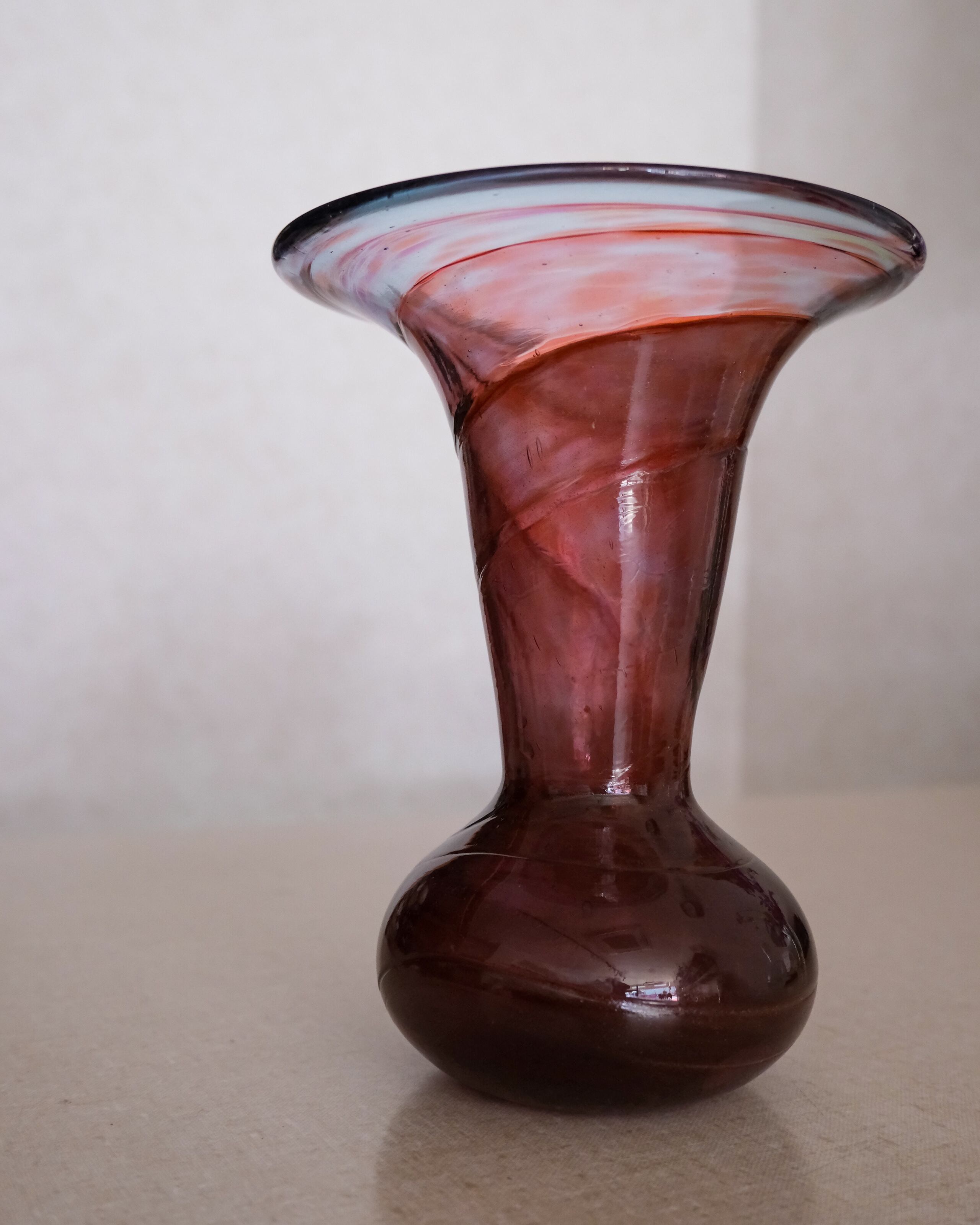 光を通すと内側の揺らぎや色の重なりが浮かび上がり、角度によって表情が変わります。