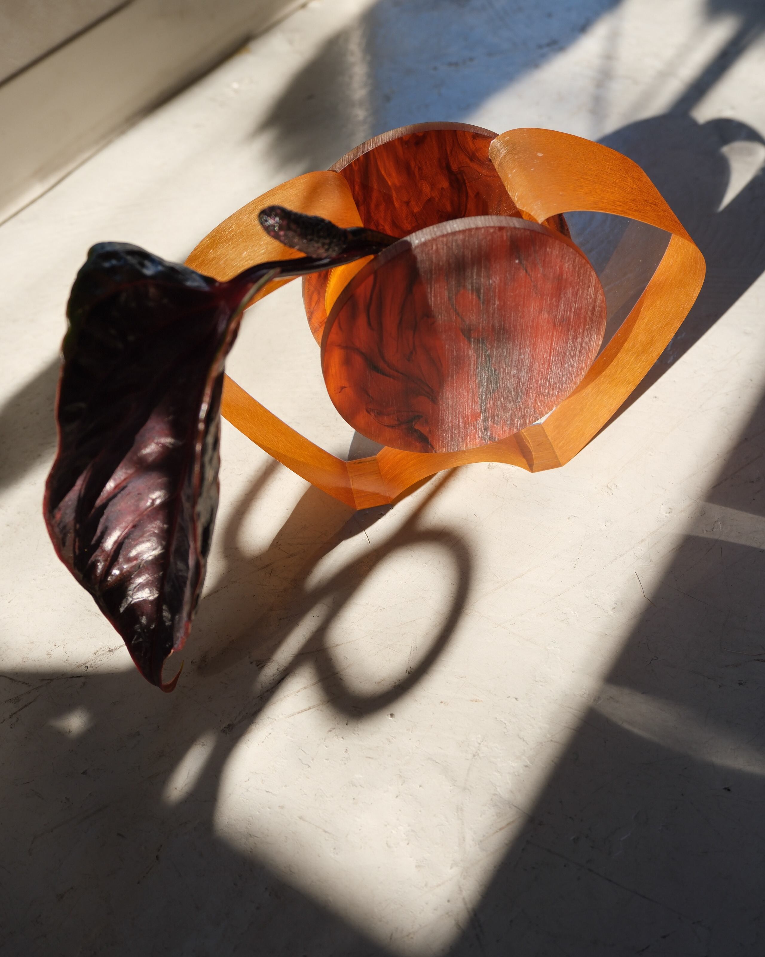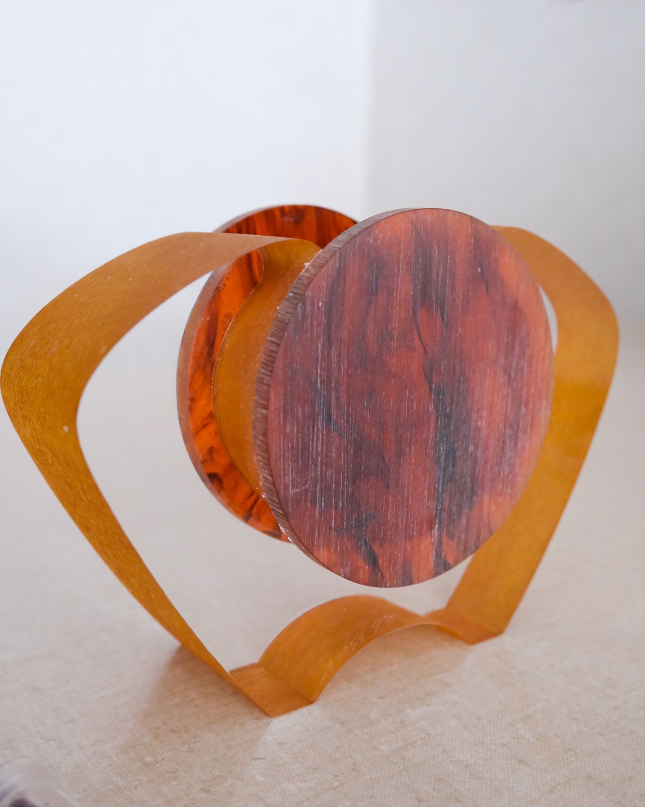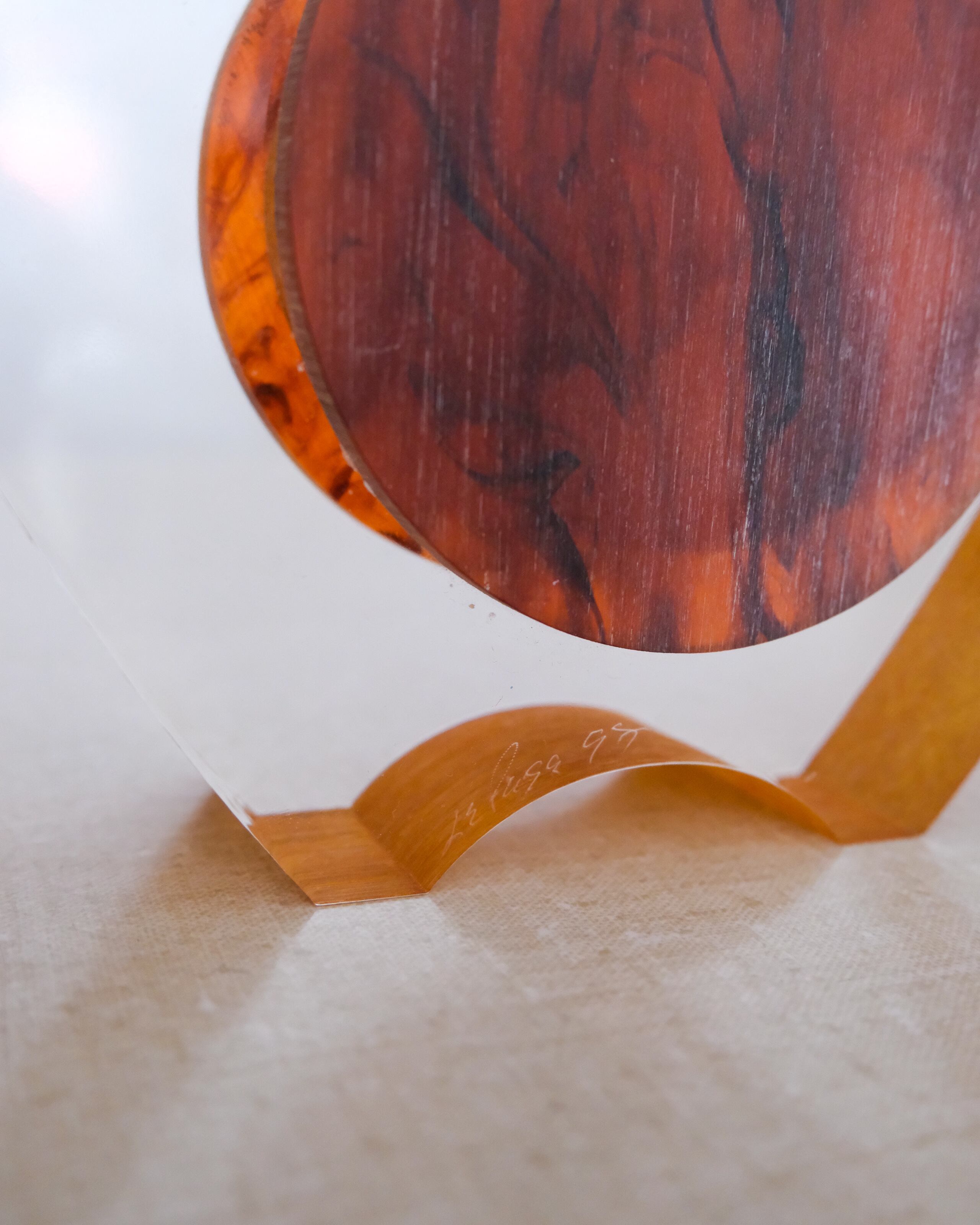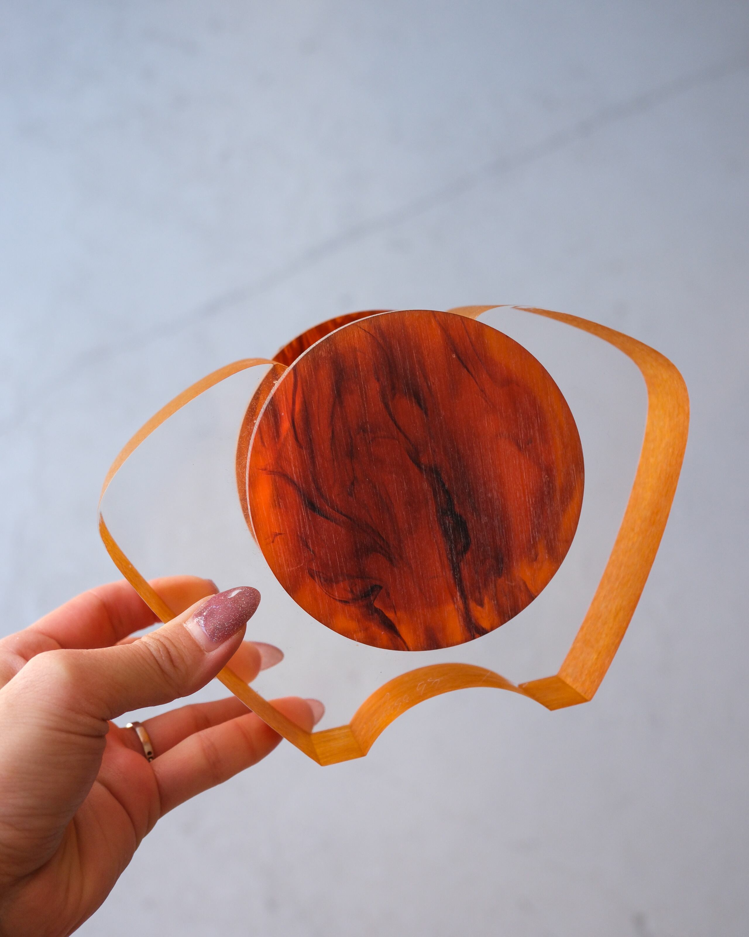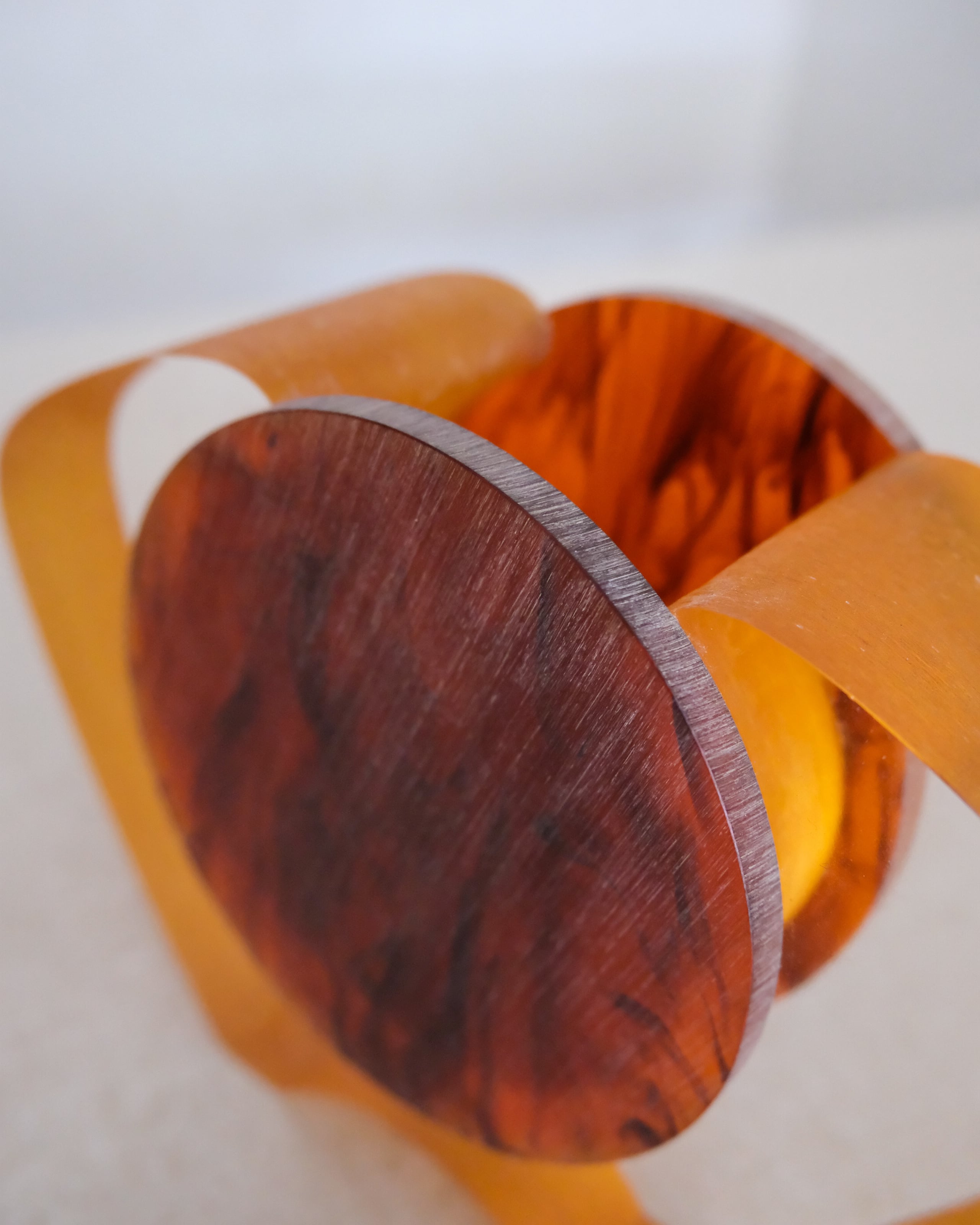 左右対称、幾何学的なアールデコスタイルを彷彿とさせるフォルムの中心に鎮座する鼈甲のようなプレート。