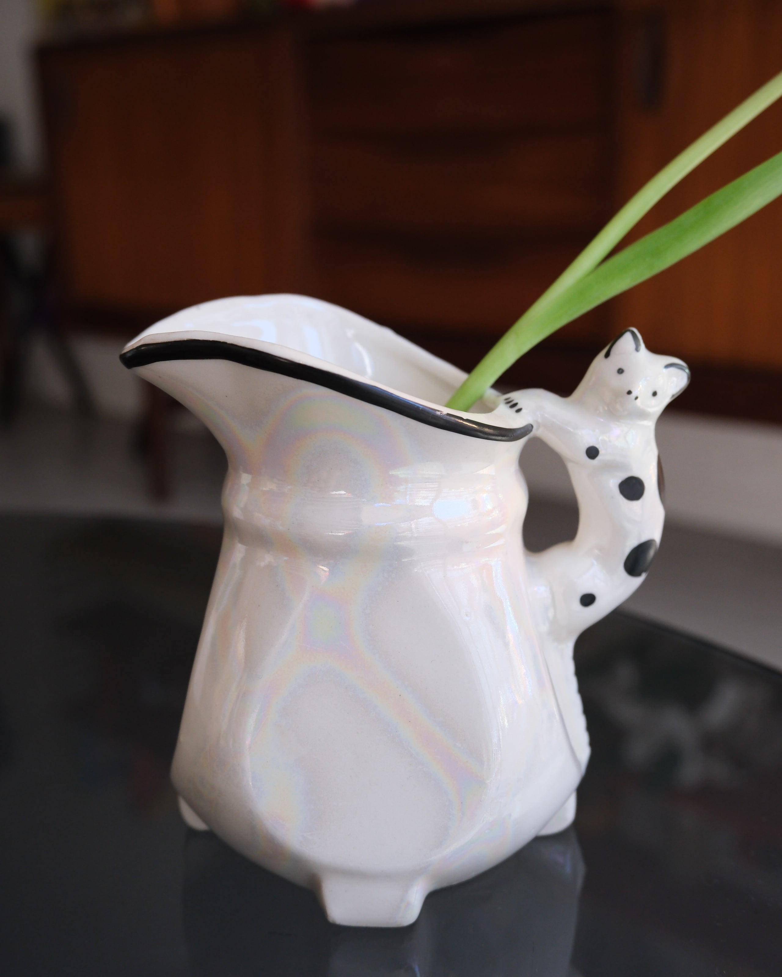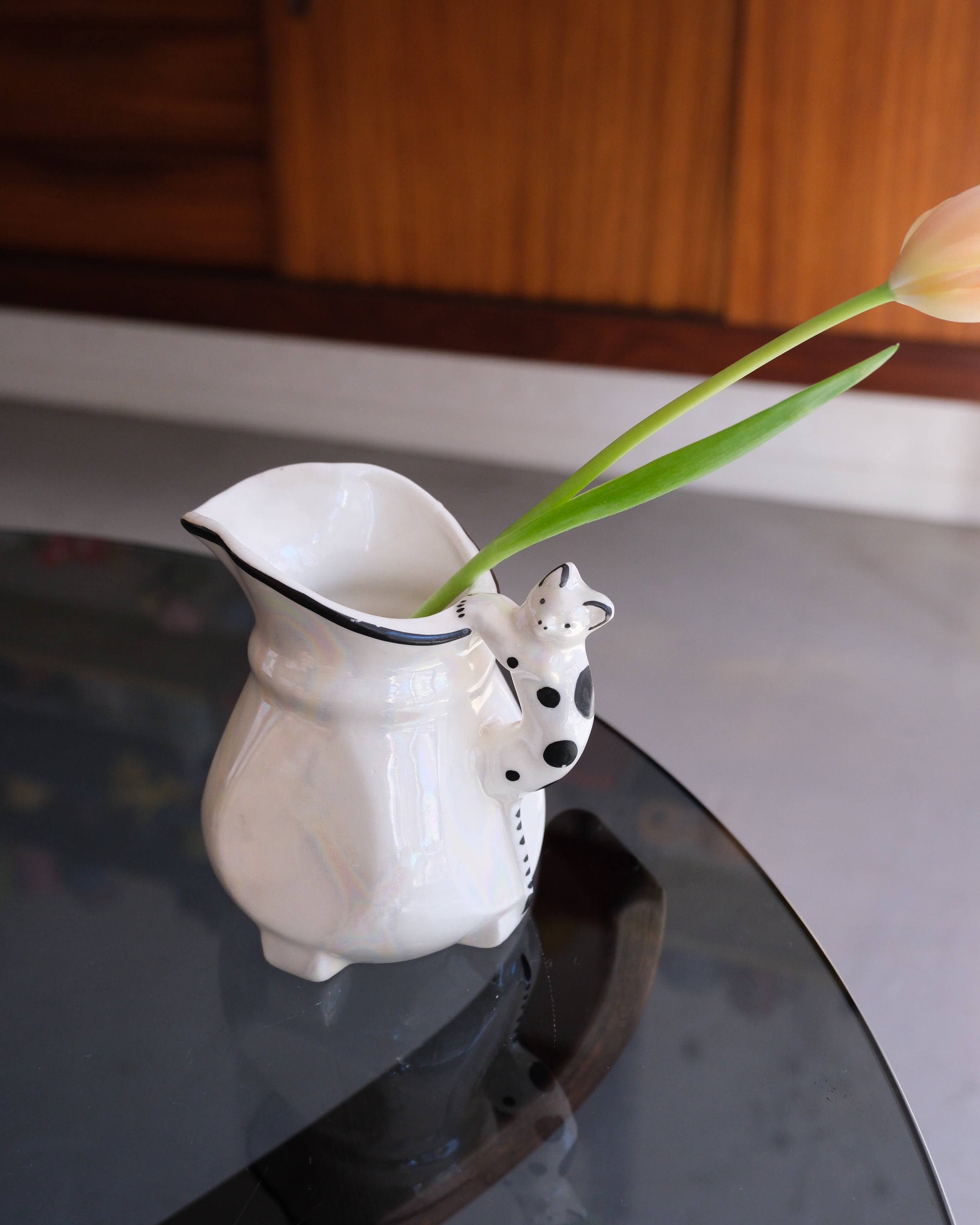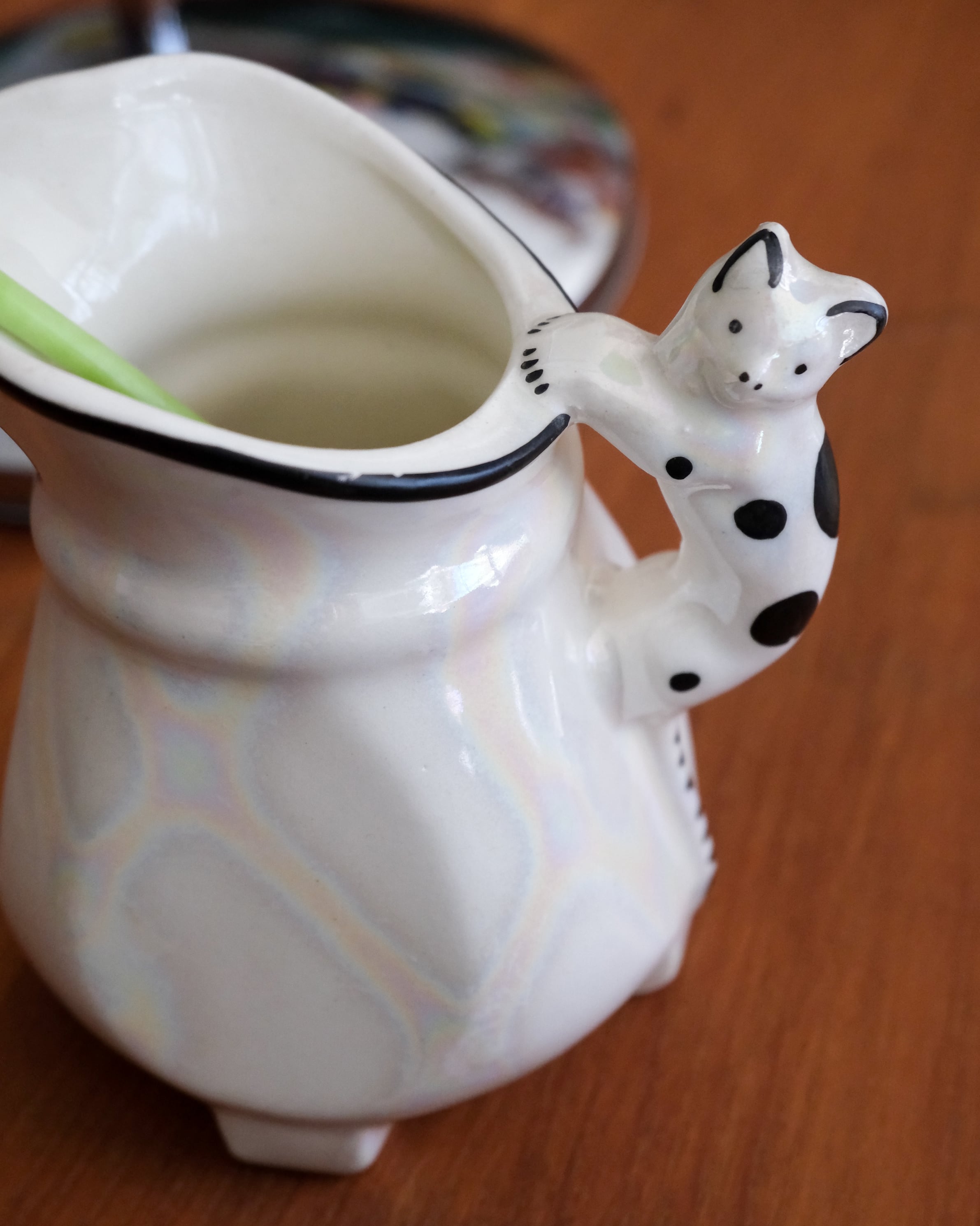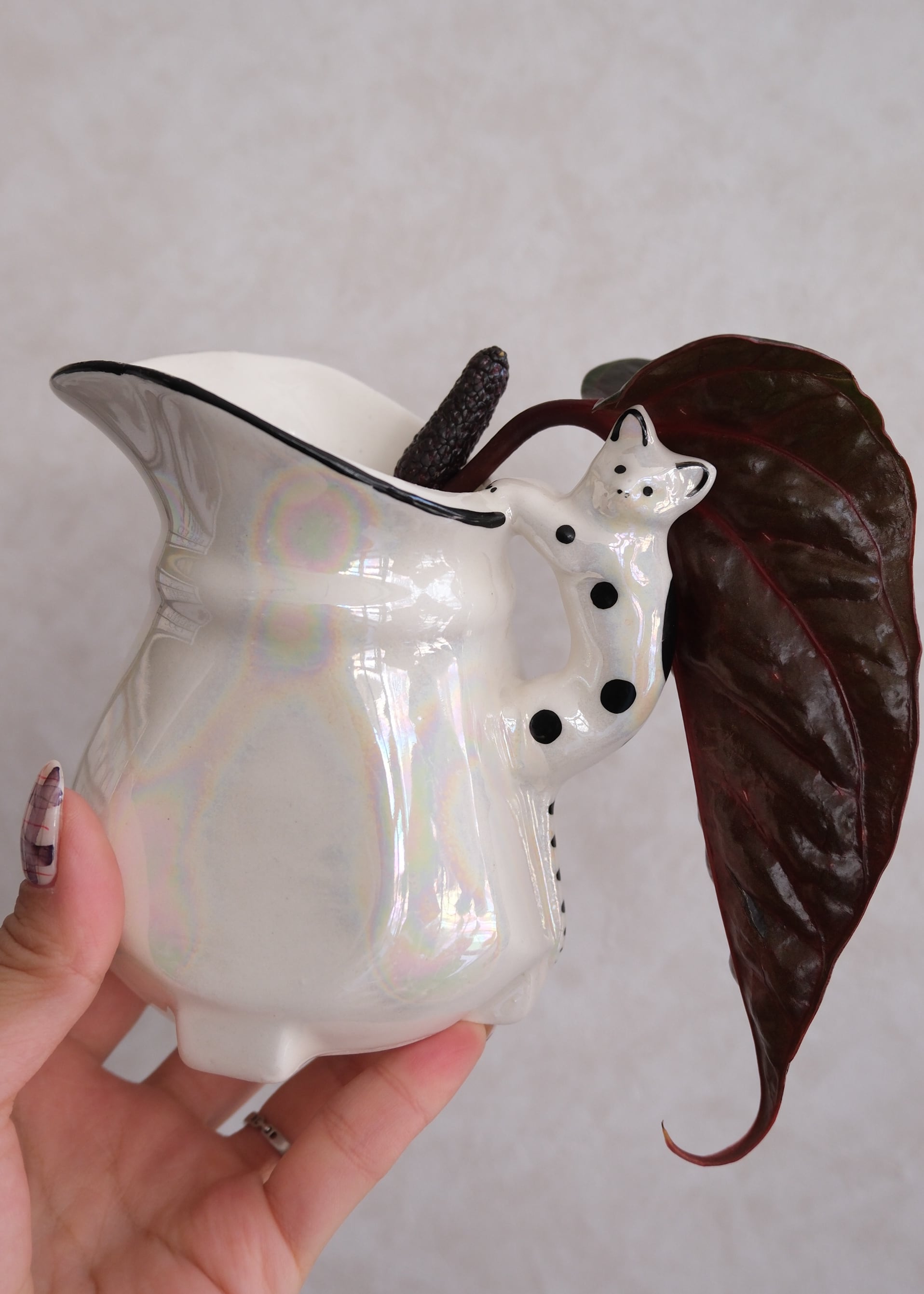 黒ブチ猫ちゃんの素朴な表情がキュートなピッチャー型。パッと見シンプルなボディは角度を変えて見るとオーロラのように虹色に発色します。