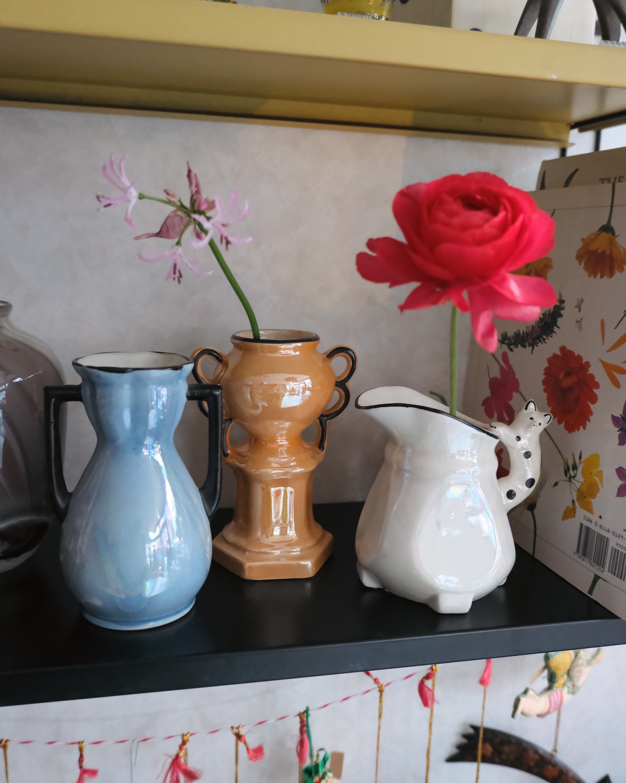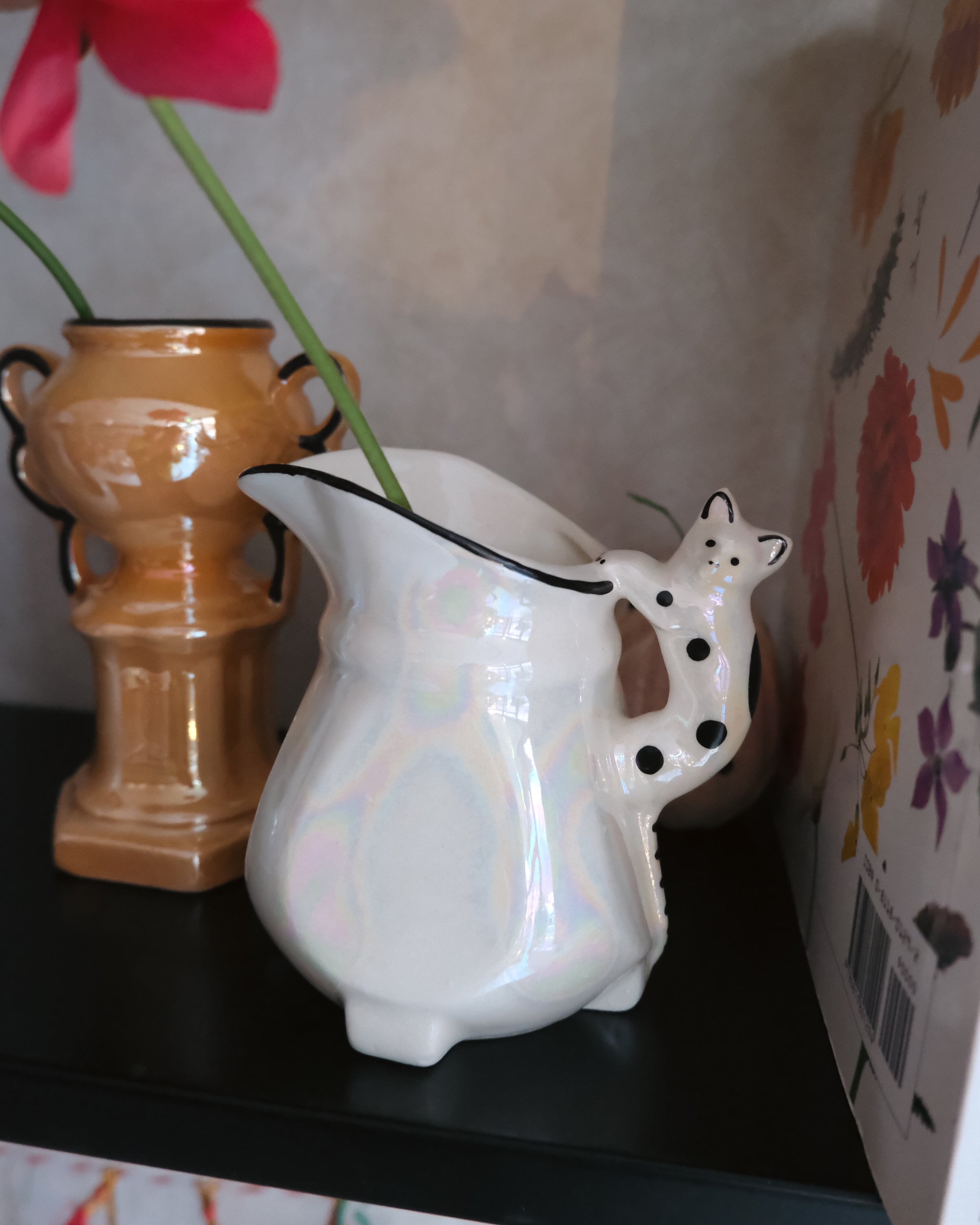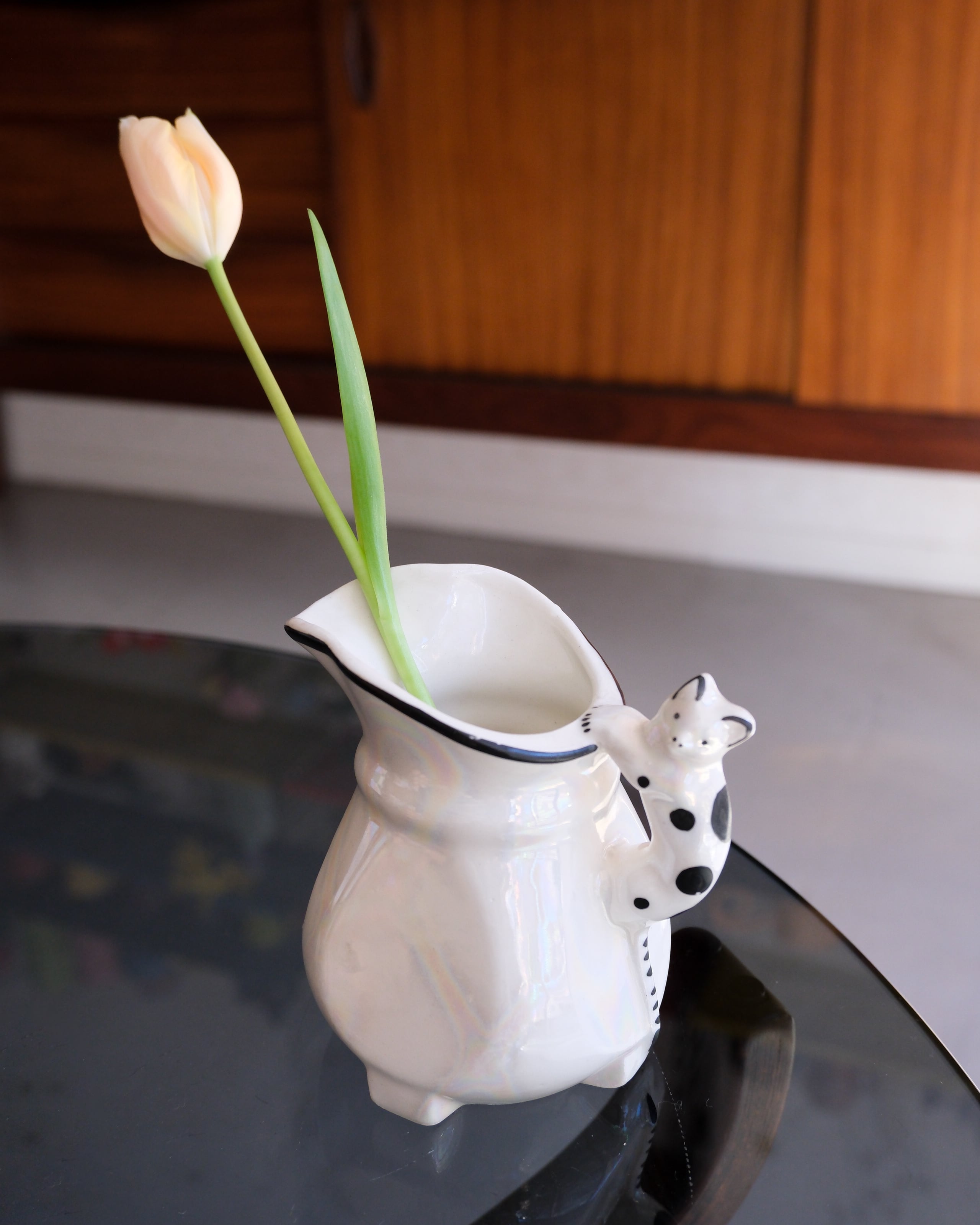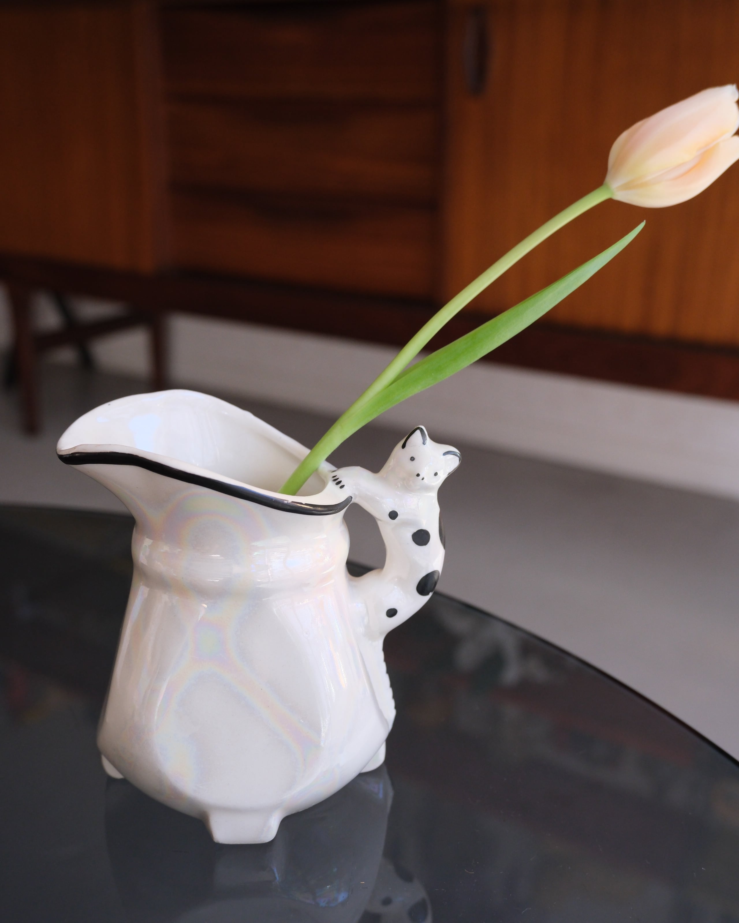 黒ブチ猫ちゃんの素朴な表情がキュートなピッチャー型。パッと見シンプルなボディは角度を変えて見るとオーロラのように虹色に発色します。