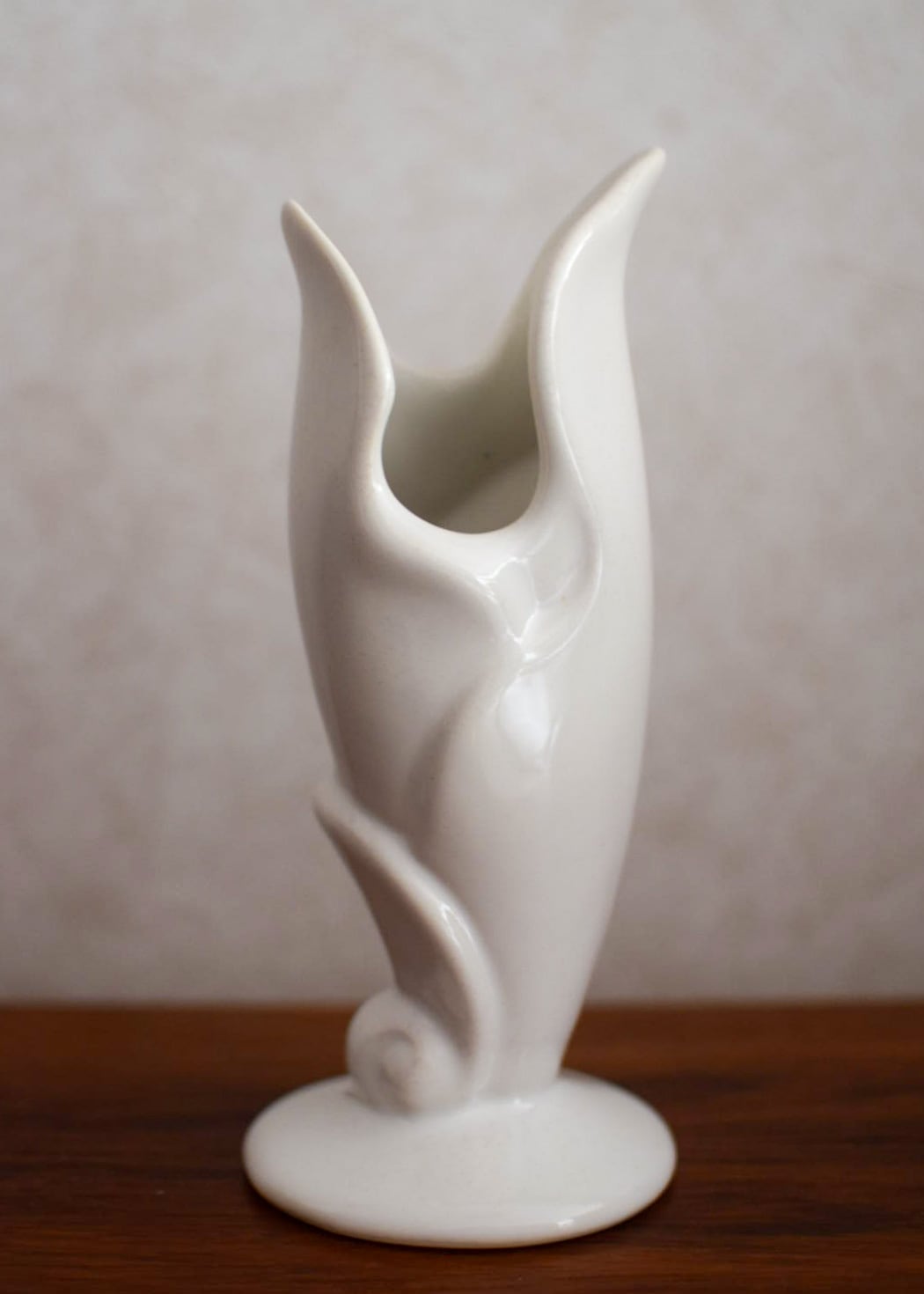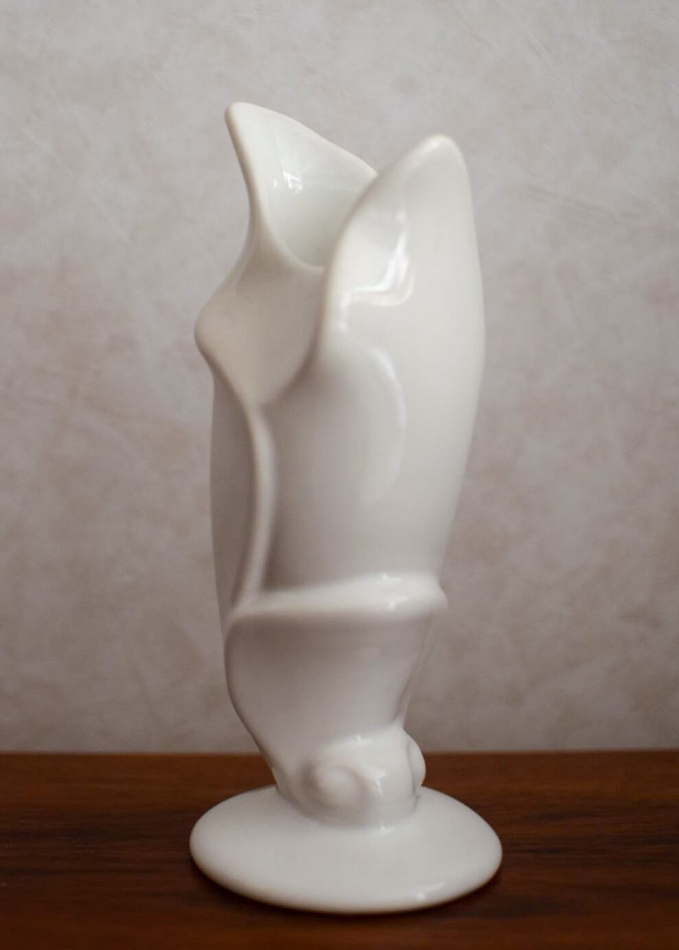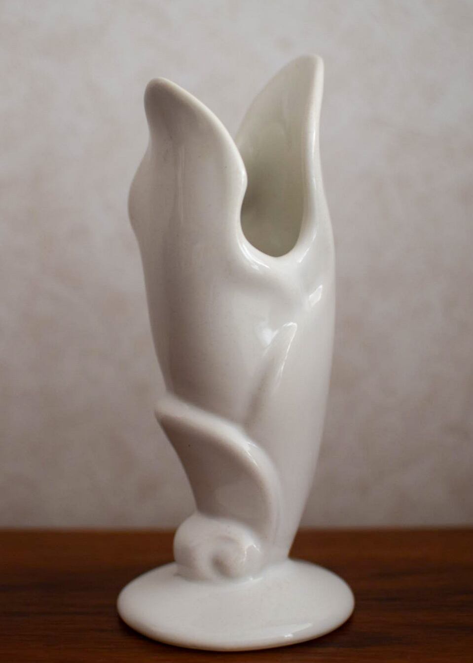 50年代 テキサス州で作られたビンテージベースです。まるで彫刻のように美しい影を落とすユニークなフォルムは、オブジェとして飾るだけで楽しめます。真っ白なボディはインテリアによく馴染み、花の魅力を存分に引き立てます。