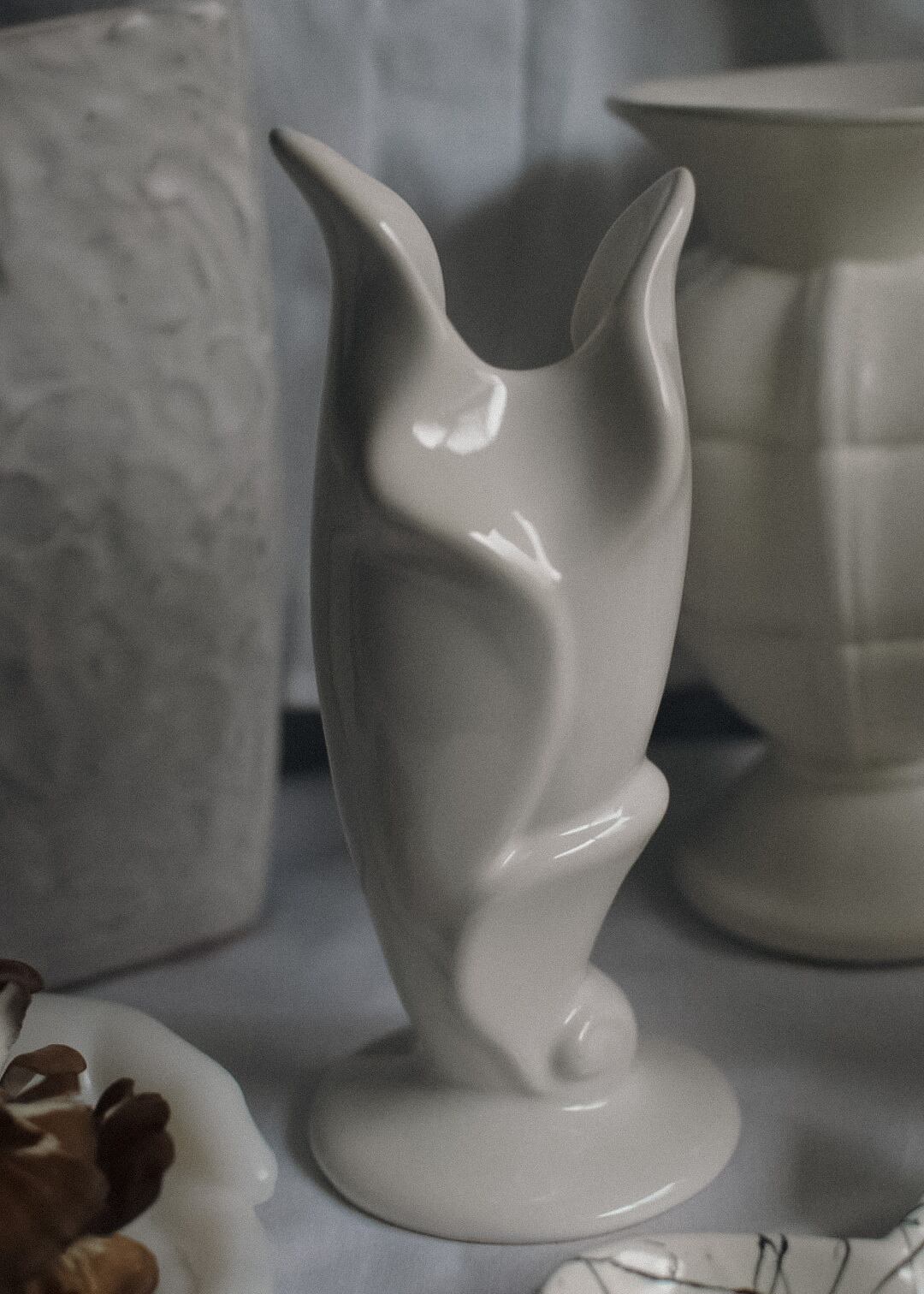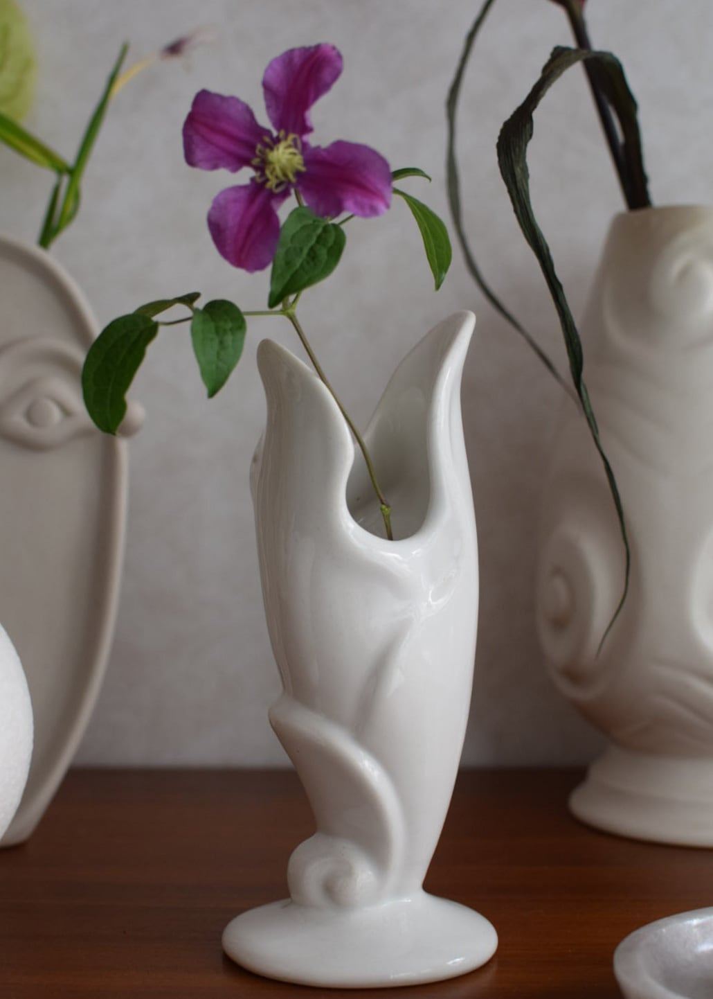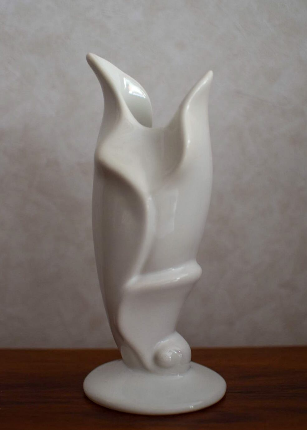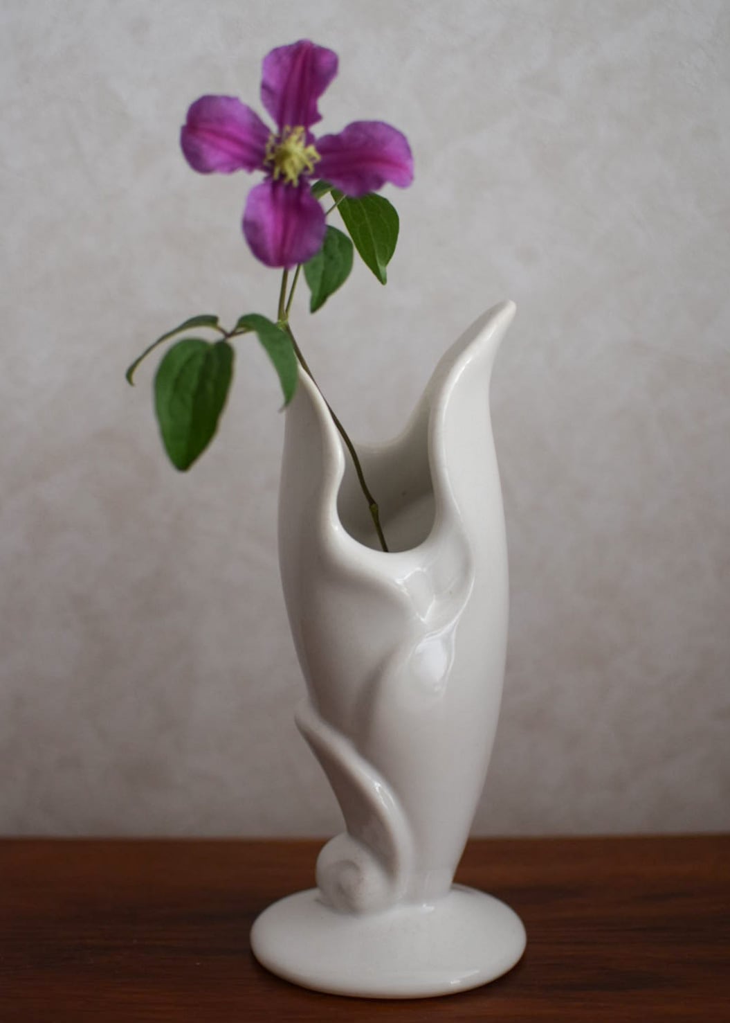 50年代 テキサス州で作られたビンテージベースです。まるで彫刻のように美しい影を落とすユニークなフォルムは、オブジェとして飾るだけで楽しめます。真っ白なボディはインテリアによく馴染み、花の魅力を存分に引き立てます。